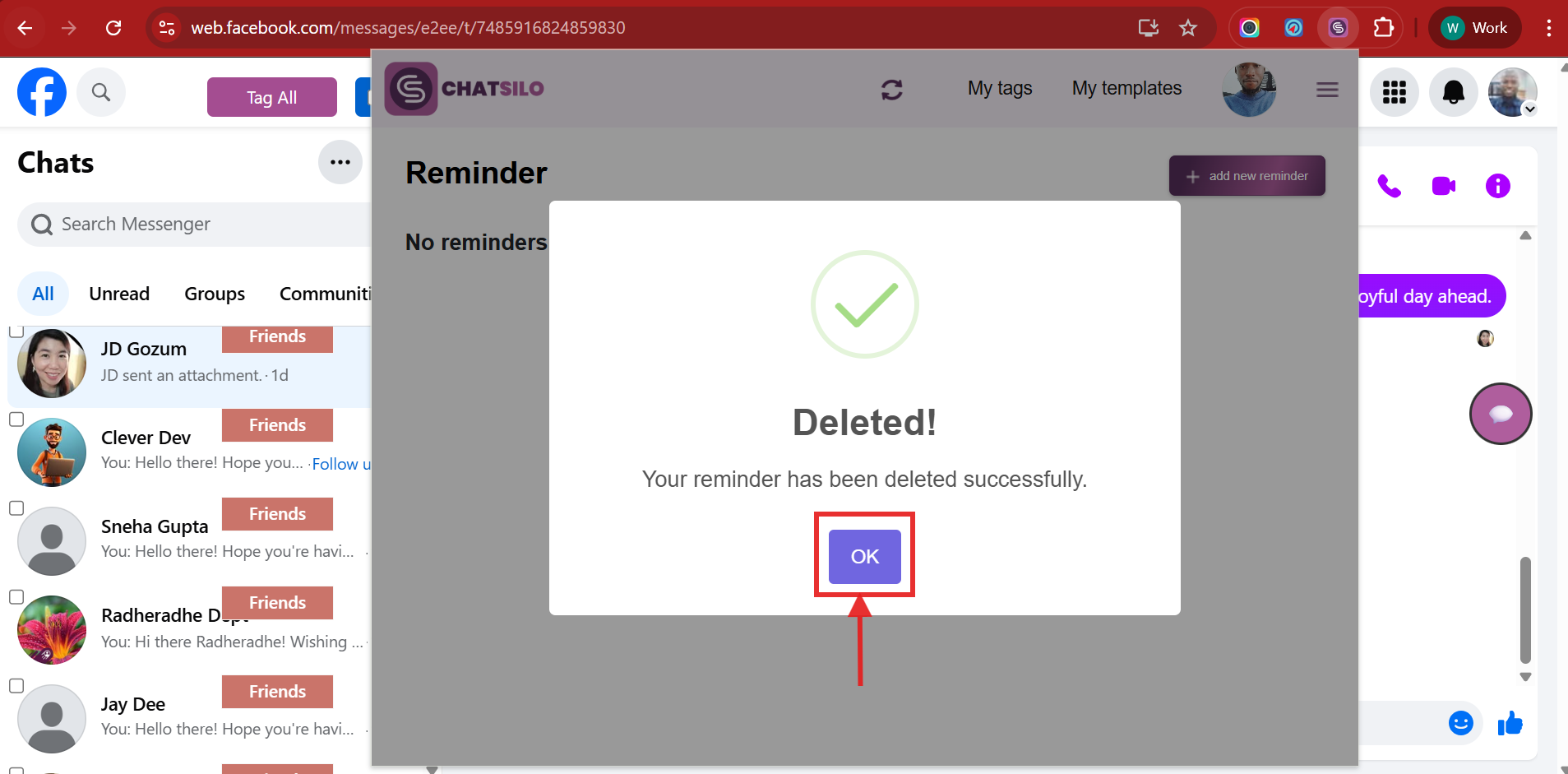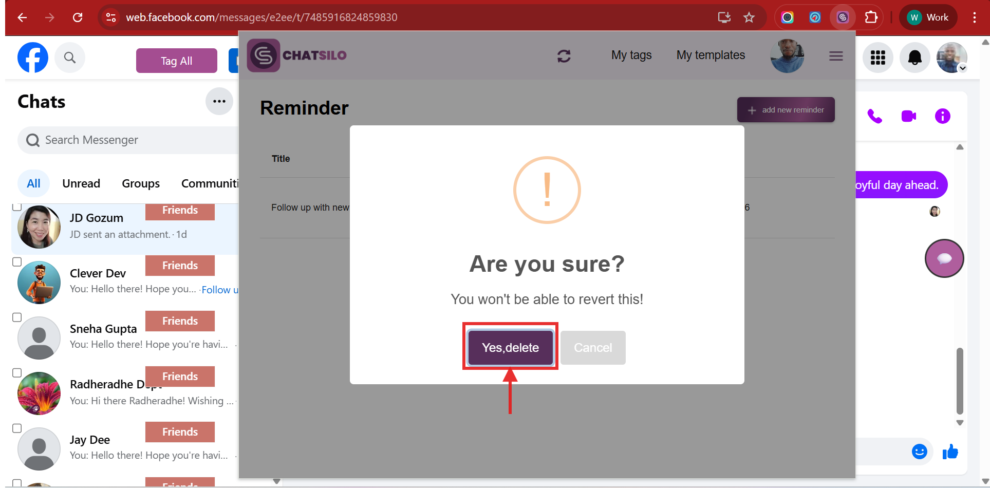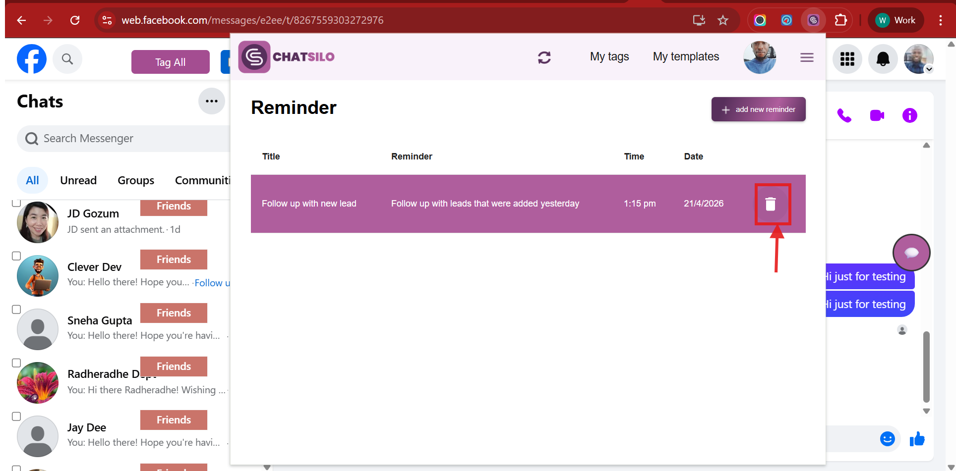 Remove any reminder you no longer need directly from the ChatSilo extension in just a few clicks.