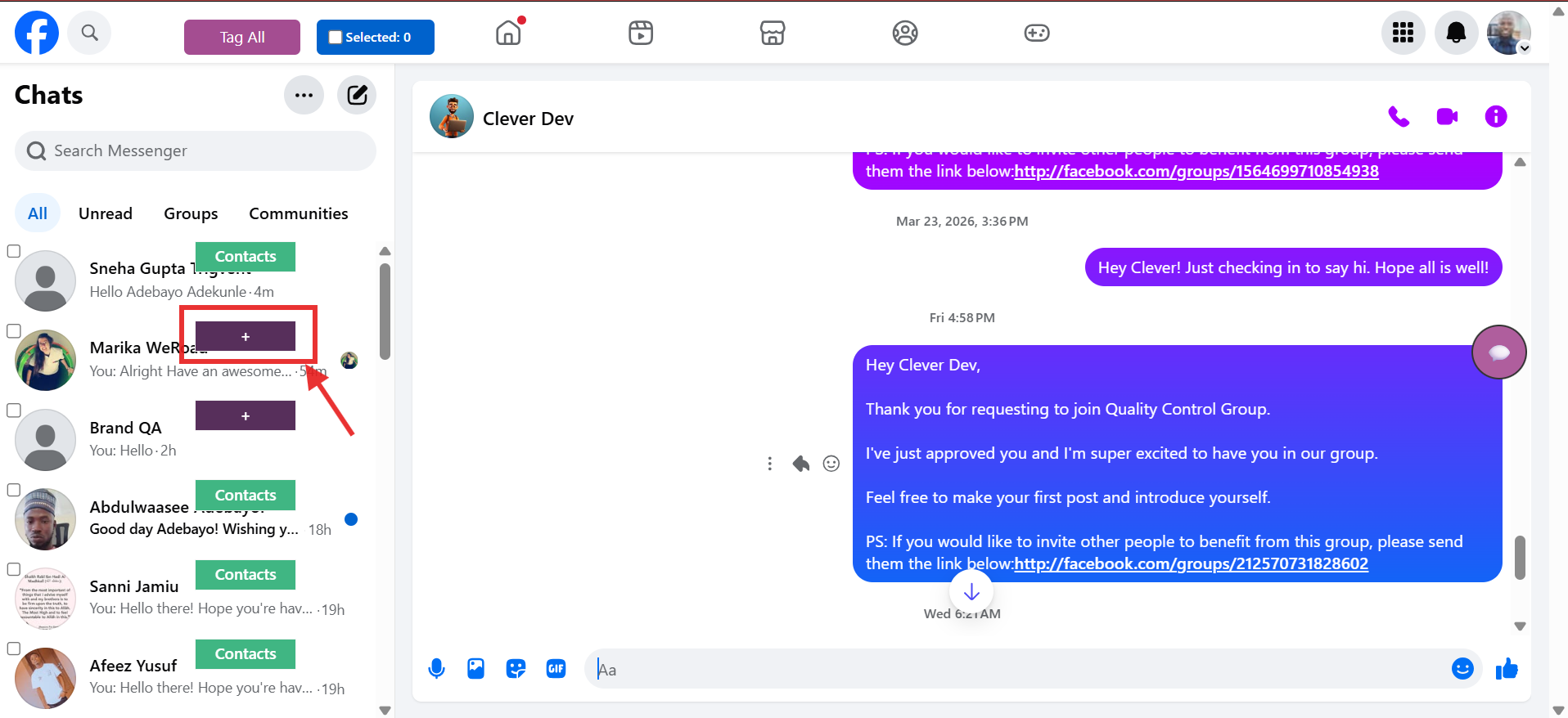 Find the contact you want to tag in the Facebook message page, then click the Add button next to their name.