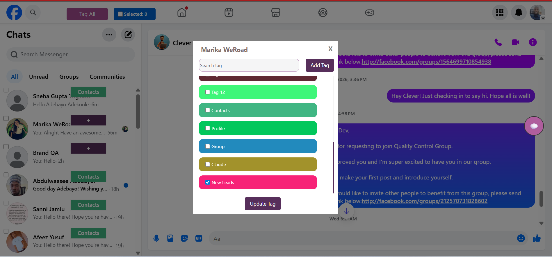 You've successfully assigned a contact to a tag in ChatSilo. Use this method to categorize all your facebook.com/messages contacts and keep your outreach organized and efficient.