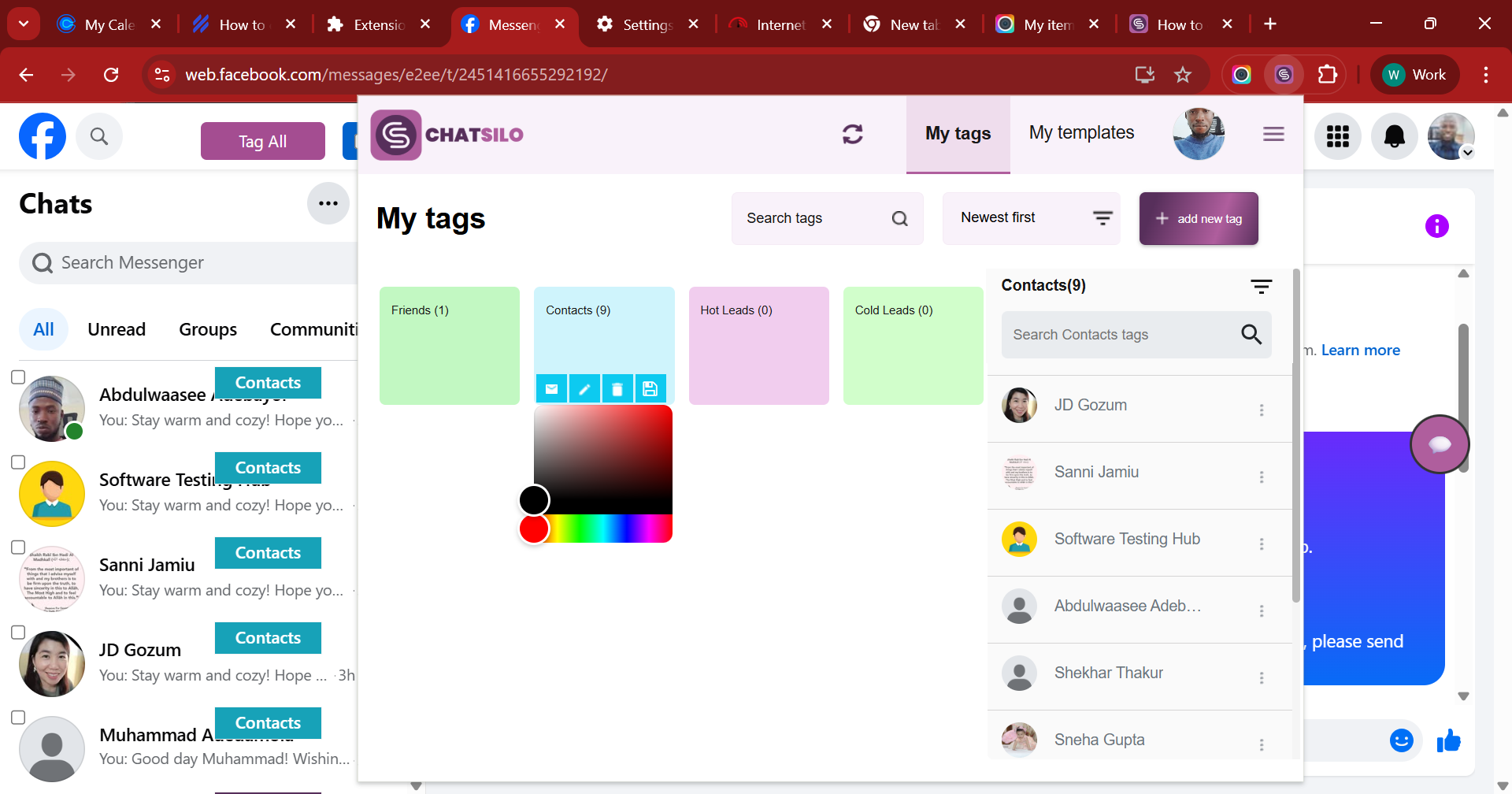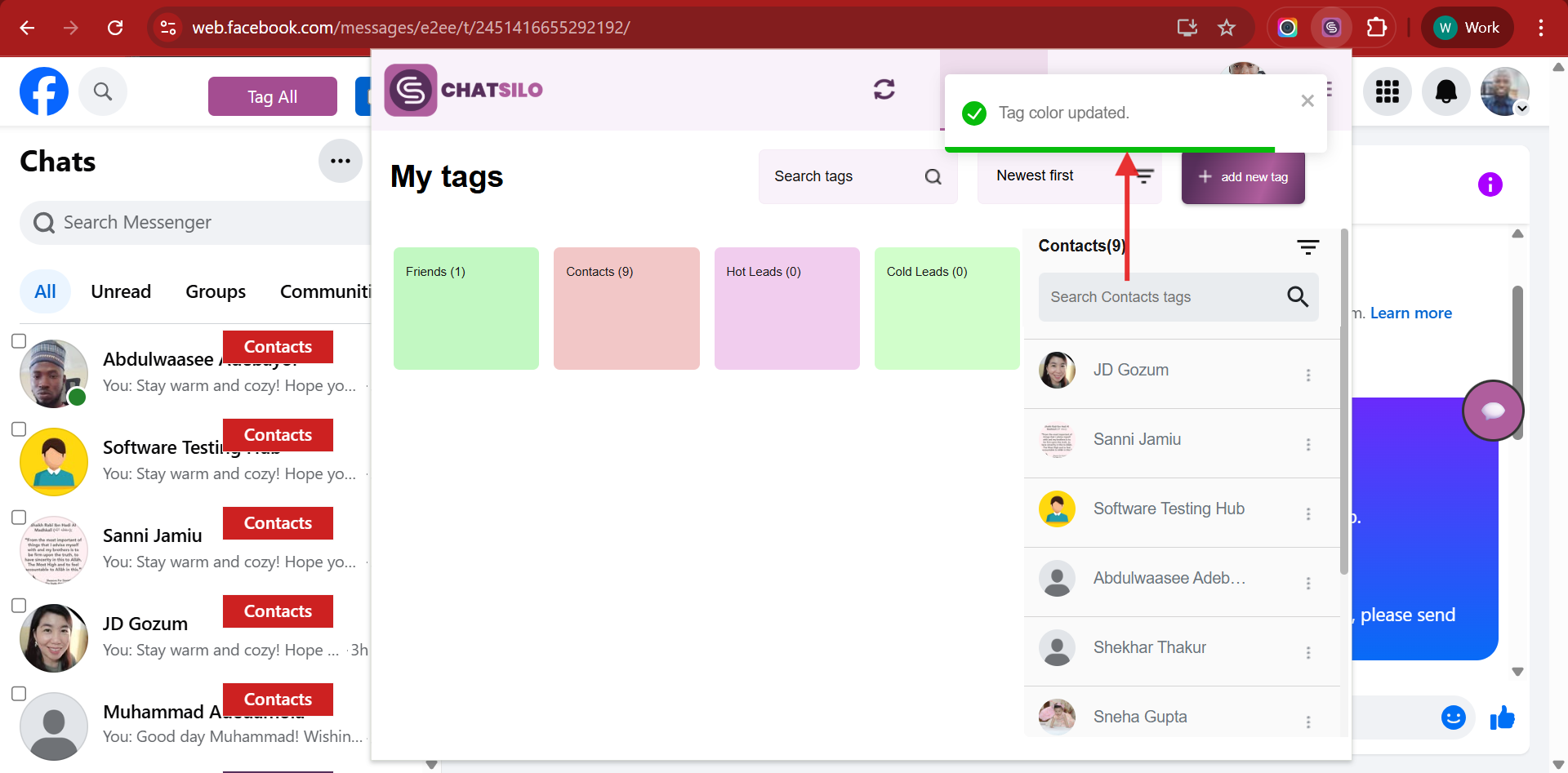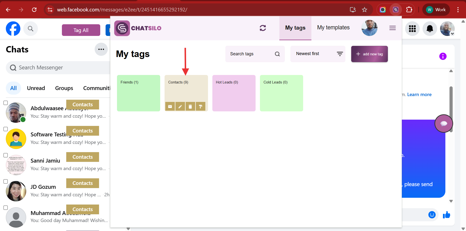 Navigate to facebook.com/messages and click the ChatSilo extension icon in your browser toolbar to open the extension panel. Then, hover over the tag whose colour you want to change.