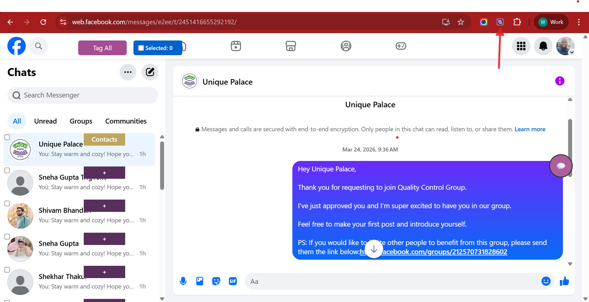 Make sure you're logged into your Facebook account and navigate to facebook.com/messages. Then, click the ChatSilo extension icon in your browser's toolbar to launch the extension panel.