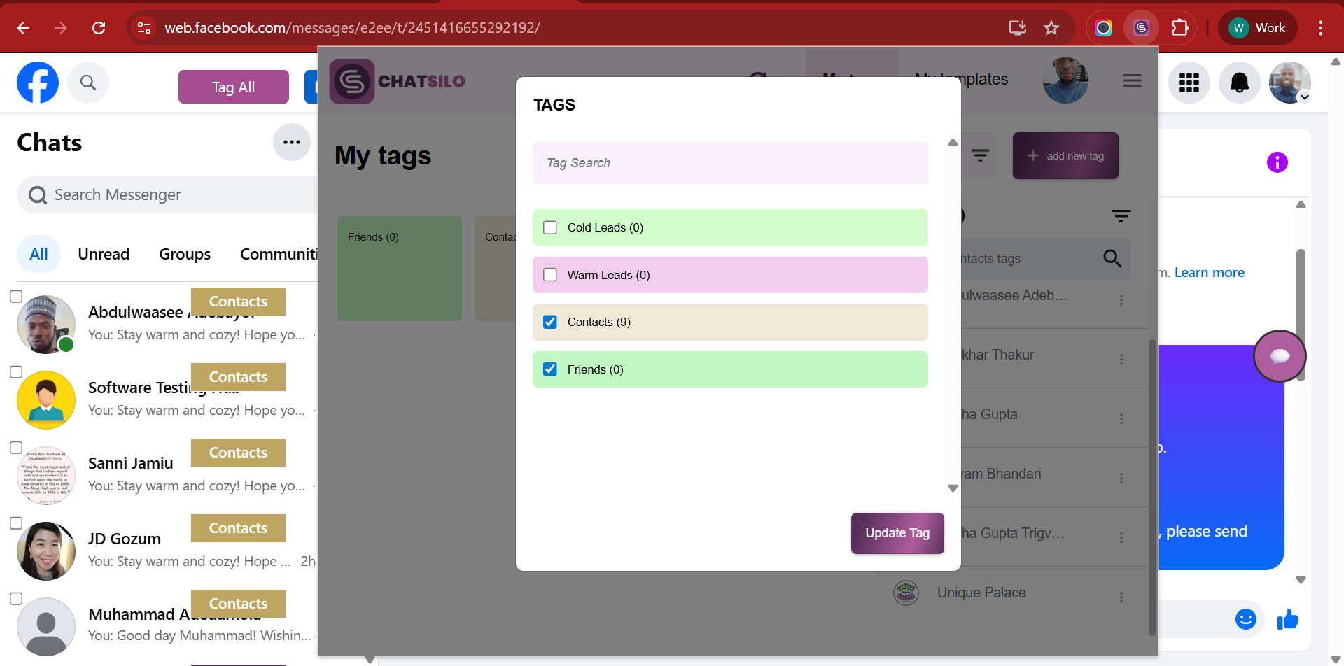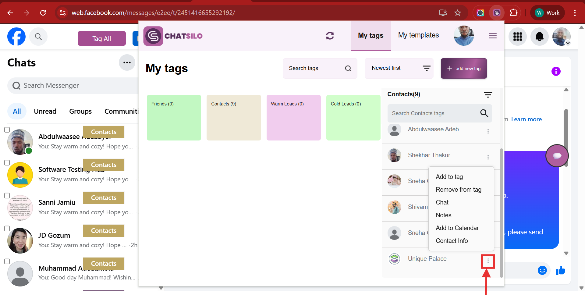 Note: ChatSilo must be active on facebook.com/messages to display your contacts and tags correctly.